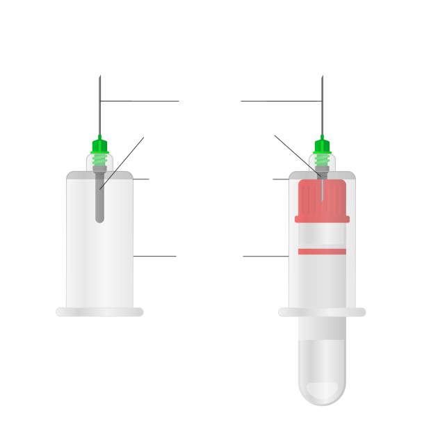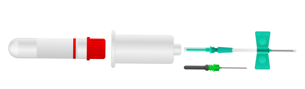 Silicone-treated needles of various types and sizes (length and diameter) are used to collection blood, depending on the patient’s veins. One end of the needle is inserted into the patient’s vein, the other punctures the rubber tube stopper.
