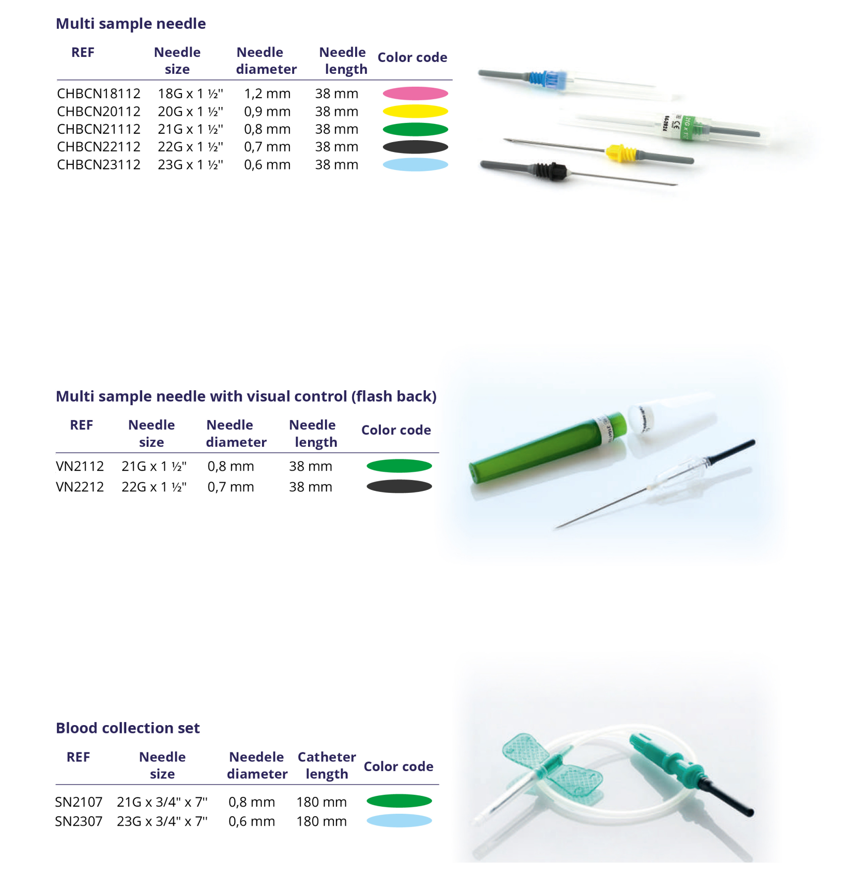 Silicone-treated needles of various types and sizes (length and diameter) are used to collection blood, depending on the patient’s veins. One end of the needle is inserted into the patient’s vein, the other punctures the rubber tube stopper.