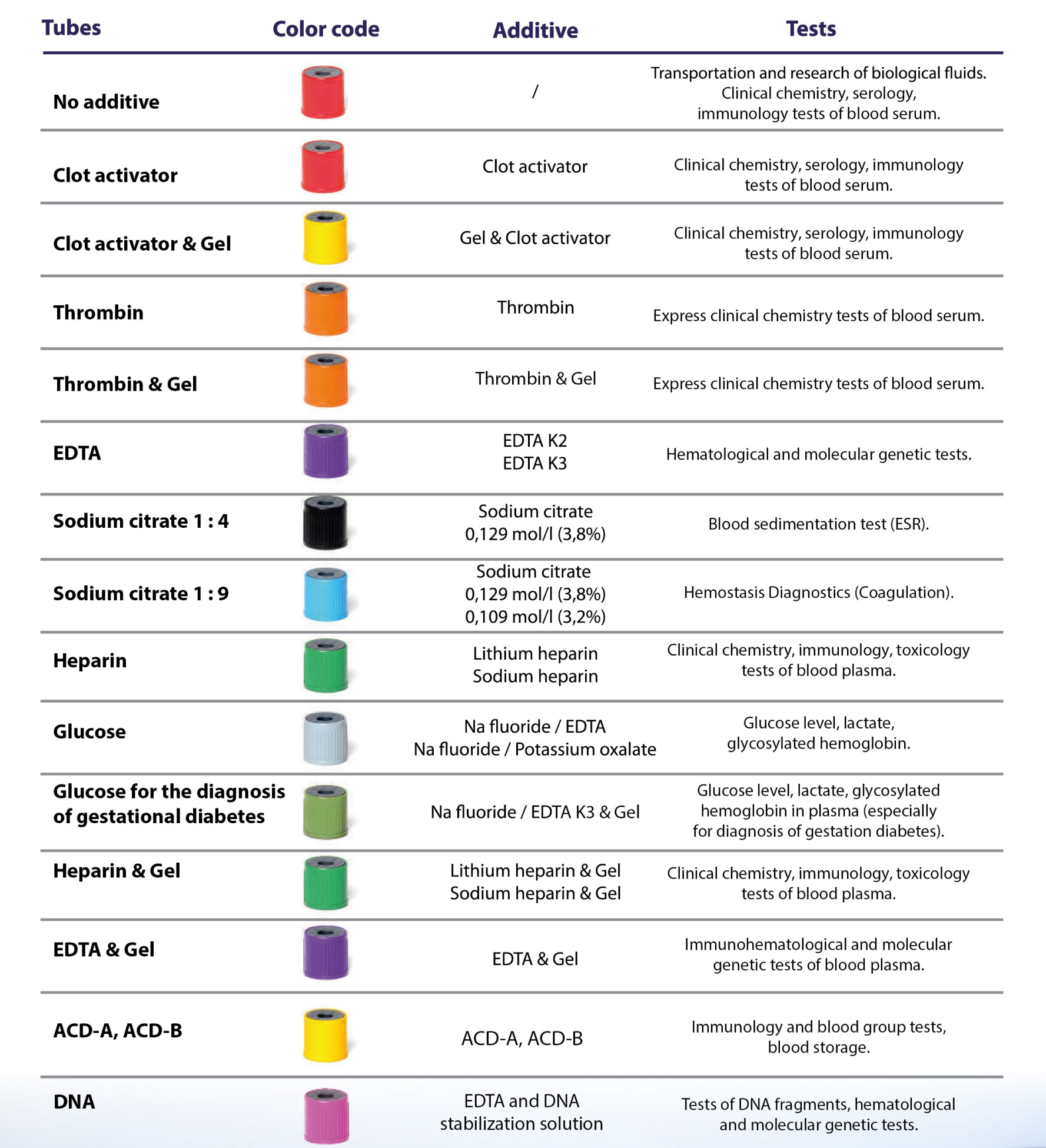 All test tubes already contain the required reagents for conducting different kinds of analyses, which are applied on test tube walls by means of spraying (except for the test tubes which do not need reagents) in the required concentration, i.e. depending on the predetermined vacuum level. All vacuum test tubes undergo the procedure of radiation sterilization.
